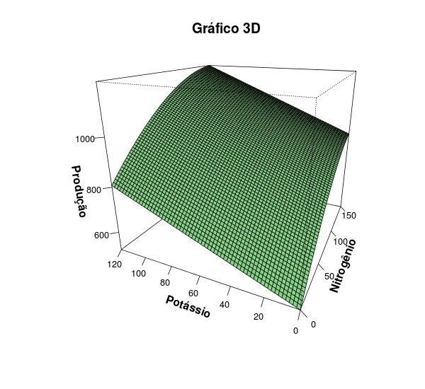 persp(n, k, rede, theta=295, phi=20, expand=0.9, col="light green", xlab = "Nitrogênio", ylab = "Potássio", zlab = "Produção",shade = 0.2, ticktype = "detailed", font.lab=2, cex.axis=0.8, main="Gráfico 3D")